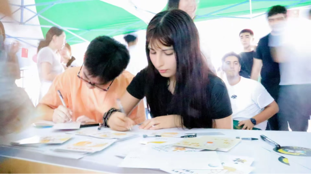 在这次的游园会中,我们组织了外国学子的中秋寄语活动。外国学子将化身 “工作人员”,用母语在专属明信片上书写祝福;我们则以辅助工作人员的身份从旁协助,助力他们顺利完成创作。