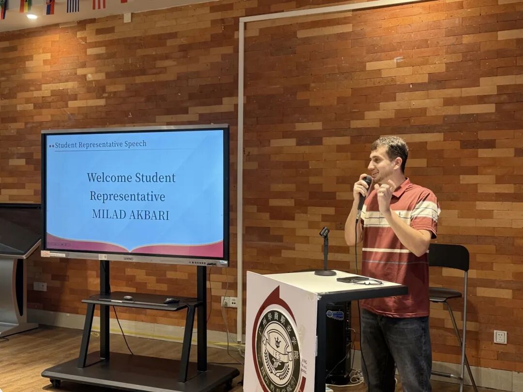 随后,在校生代表Milad Akbari分享了其在华职的学习生活体验。他表示,在老师和同学们的关怀与帮助下,自己已逐步适应本地生活,中文沟通能力显著提升,初来时的陌生感已转化为如今的归属感与获得感。他鼓励新生积极融入校园,认真学习汉语,也祝愿同学们在中国度过充实而难忘的求学时光。
