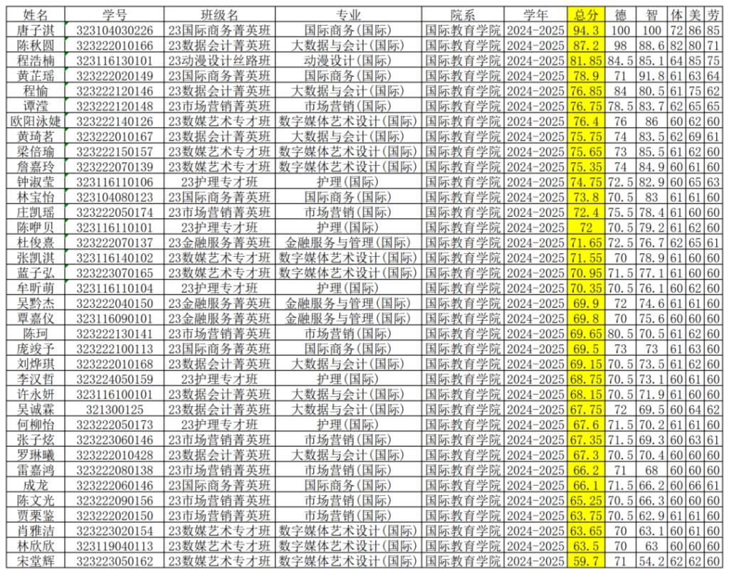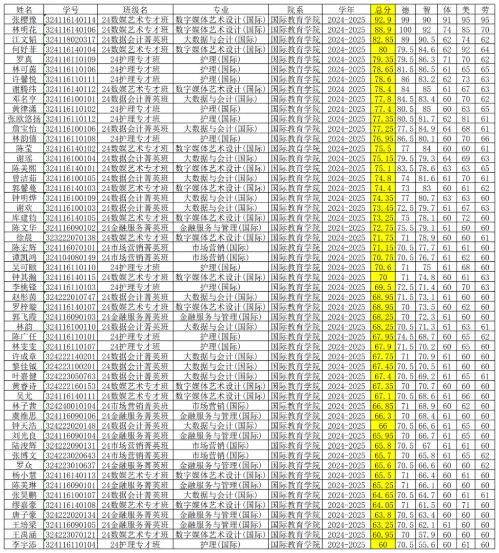 2024-2025学年学生综合素质测评成绩公示